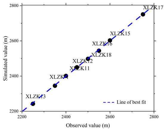 Therefore, to ensure the constructed groundwater flow model accurately represents the hydrogeological regime of the study area and reliably predicts environmental impacts induced by tunnel construction, calibration was performed using observed water levels from monitoring boreholes within the model domain. Permeability coefficients (K) fields were optimized exclusively through PEST-based inverse modeling to minimize head residuals at eight observed boreholes. Through iterative refinement of parameter values within plausible ranges across designated model zones, simulated borehole water levels were brought into alignment with field measurements (as shown in Figure 5).