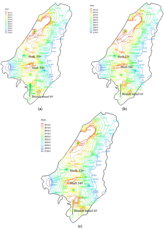 Model groundwater level map of (a) Branch tunnel 6# under natural condition, (b) Branch tunnel 6# under cement grouting condition, and (c) Branch tunnel 6# under microfine cement grouting condition.