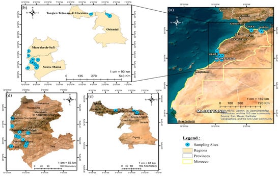 Study area’s location in Morocco (a), the four administrative regions of sampling (b), and sampling sites in the northern region (c) and the southern region (d).