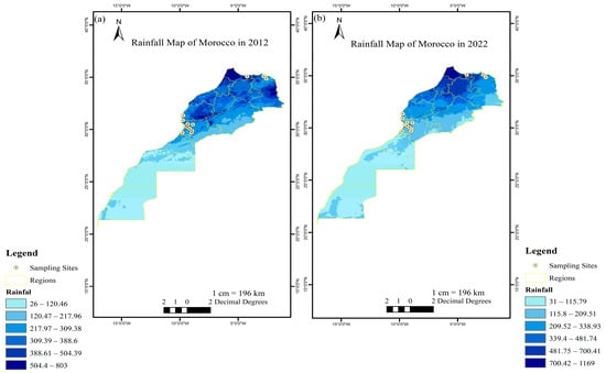 Rainfall maps of Morocco of the last decade in 2012 (a) and 2022 (b).