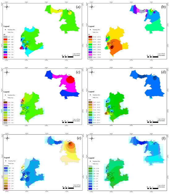 Spatial distribution maps of (a) potential of hydrogen, (b) electrical conductivity, (c) the degree of oxidation, (d) the oxidation–reduction potential, (e) turbidity, (f) salinity.