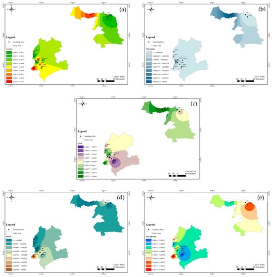 Spatial distribution maps of (a) arsenic, (b) chromium, (c) lead, (d) nickel, (e) molybdenum.