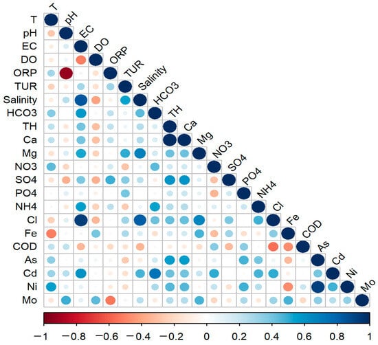 The correlation matrix provided in Figure 6 encompasses a plethora of parameters associated with water quality analysis. The variables include temperature and various chemical compositions and pollutant concentrations such as pH, EC, DO, redox potential, TUR, SAL, , TH, Ca2+, Mg2+, , , , Cl−, Fe, COD, As, Cr, Cd, Pb, Ni, Mo, and Cu. Each cell in the matrix represents the correlation coefficient between two parameters, ranging from −1 to 1. A perfect positive correlation coefficient is indicated by a correlation coefficient of 1, suggesting that as one variable increases, the other also increases. Oppositely, a perfect negative correlation is indicated by a correlation coefficient of −1, suggesting that as one variable increases, the other decreases. No correlation is indicated by 0.