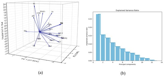 Principal Component Analysis (PCA) is a statistical method that provides insights into the key characteristics that shape the interpretation of a dataset. It aids in data reduction and reveals statistical relationships among water constituents while preserving the essential information [46,91,92]. It has been employed to discern both human-made and natural influences on surface water quality [70,93]. Factor analysis is a method for reducing a large number of linked variables to a smaller number of super variables while simultaneously defining the links between observable variables and potentially unknown factors [94,95].