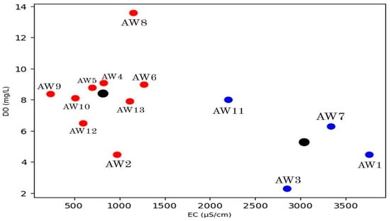 Salinity refers to the concentration of dissolved salts in water, which directly contributes to its conductivity, hence the strong positive correlation (0.982) between salinity and electrical conductivity. Consequently, areas with high salinity tend to have higher electrical conductivity, like the sampling sites of AW, AW3, and AW7. The consequence of this correlation is particularly important in assessing the salinity of water bodies, especially in regions where saltwater intrusion or anthropogenic activities affect freshwater resources and agricultural practices [85].