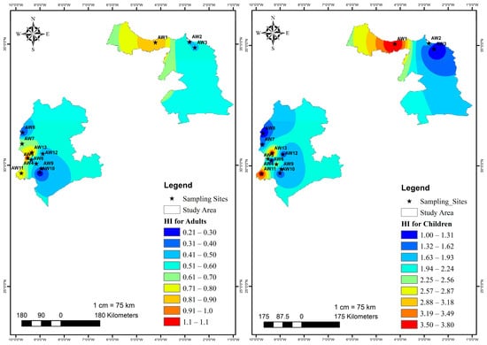 To assess exposure risks for both adults and children through drinking water, the daily intake was calculated based on the U.S. Environmental Protection Agency (EPA) guidelines [62]. Water samples with HQ values below 1 are considered safe, while HQ values above 1 indicate potential health hazards.