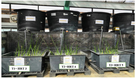 This research was conducted in a greenhouse at Universiti Kebangsaan Malaysia (UKM), located within an open, natural environment. The experimental setup was replicated to facilitate the functioning of three constructed wetlands (CWs) planted with S. grossus (T1 exhibiting a hydraulic retention time of 3 days, T2 at 4 days, and T3 at 5 days) under ambient conditions of 30 ± 5 °C with 10 h of sunlight. The subfloor wetland reactors were engineered to accommodate a total effluent volume of 45 L, characterized by dimensions of 1 m in width, 1 m in length, 60 cm in height, and a thickness of 0.5 cm. Three identical reactors were utilized, each comprising a sand–gravel layer constructed from fiberglass. The layers within the sand strata, arranged from the base to the top, included the following: (i) a 15 cm layer of gravel with particle sizes ranging from 10 to 20 mm, (ii) a 5 cm layer of fine sand with a particle diameter of 2 mm, and (iii) a 1 cm layer of gravel with diameters between 1 and 5 mm. The total mass of the sand was recorded as 77 kg. A 22.5 cm thick gravel layer, with particle sizes ranging from 10 to 20 mm, was employed to stabilize both the inlet and outlet flows. The main study concentrated on plants that had undergone a 30-day acclimatization period. Each vertical subsurface flow constructed wetland (VSSFCW) received twenty healthy S. grossus plants that had successfully completed the acclimatization process. Figure 1 depicts that each reactor was meticulously designed for continuous operation, with discharge rates of 15, 11.25, and 9 L/day, corresponding to hydraulic retention times of 3, 4, and 5 days, respectively. All analyses in this research were conducted in triplicate. The optimum HRT condition was selected based on the removal of IBP and PAR, and the results of the validation run (with and without rhizobacterial addition, following Section 2.5) are presented in this article.