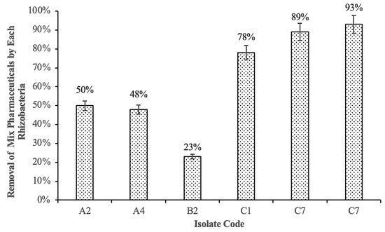 Six of the twenty-eight isolated rhizobacteria exhibited good growth on TSA, and these rhizobacteria were subsequently subjected to degradation assays. The results indicated that all six bacteria can degrade IBP and PAR during pharmaceutical exposure (Figure 2). The removals by bacteria C1, C2, and C7 were 78%, 89%, and 93%, respectively. Meanwhile, the removals by A2, A4, and B2 were only 50%, 48%, and 23%, respectively. Bacteria C1, C2, and C7 had the best degradation. Based on these findings, C1, C2, and C7 were chosen in the subsequent experiment to test for pharmaceutical degradation as a monoculture (Figure 3 and Figure 4).