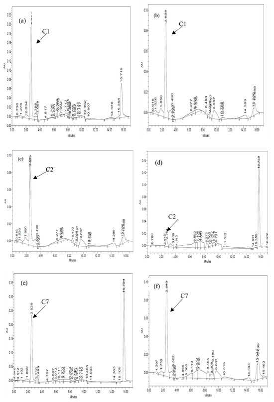 Chromatogram of paracetamol extracted at 0 and 120 h for monoculture: (a) C1 day 0, (b) C1 day 5, (c) C2 day 0, (d) C2 day 5, (e) C7 day 0, and (f) C7 day 5.