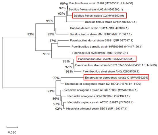 A phylogram (neighbor-joining method) showing the genetic relationship between three bacteria (inside the red boxes), Enterobacter aerogenes, Bacillus flexus, and Paenilbacillus alvei, and other related reference microorganisms based on the 16s rRNA gene sequence analysis.