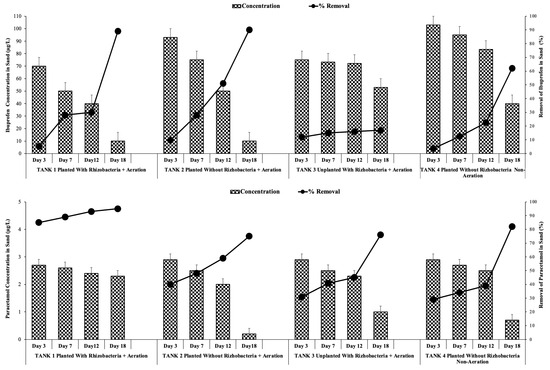 IBP and PAR concentrations in the pilot-scale treatment tank 1 with rhizobacteria addition ranged within 70–10 and 2.70–2.30 µg/L, respectively, with removal efficiencies of 89 and 95% after 18 days of treatment (Figure 7). Statistical analysis revealed that rhizobacteria addition provided a significant difference between sand IBP and PAR concentrations and removal efficiency (p < 0.05).