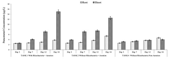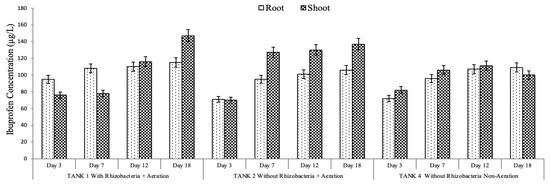The results showed that IBP and PAR were detected inside the plant, indicating that IBP and PAR were adsorbed and accumulated in the roots and the shoots. This finding was consistent with that of previous research, indicating that plants can rapidly absorb xenobiotics and other pharmaceutical compounds [31]. Figure 8 shows that IBP and PAR concentrations in the roots and shoots were increased until day 18. Overall, pharmaceutical concentrations were on average higher in the upper part than in the root in both modes (with and without rhizobacteria addition), implying that IBP and PAR were absorbed and translocated to the upper part [51].