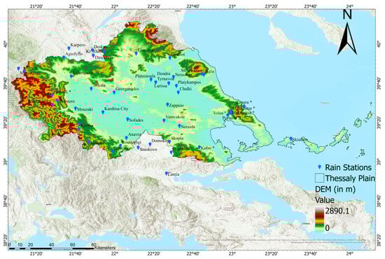 The case study area is the Pinios River basin (GR16), which is the largest drainage basin in the Thessaly Water District (GR08), with an area of 10,700 km2 (Figure 1). The average annual precipitation is 779 mm, and the mean annual runoff is 3499 × 106 m3/y (327 mm) or 110,95 m3/s. Geographically, it lies within latitudes 39°11′–39°58′ N and longitudes 21°52′–22°45′ E (Figure 1), bordered by extensive plains and mountainous regions, including Mount Olympus (2918 m), Greece’s highest point. The Thessaly Plain in the center is one of Greece’s most fertile agricultural regions, consisting mainly of flat land covered by alluvial deposits [31]. Agriculture occupies 49.5% of the land cover in the Thessaly Water District, and the plain accounts for 14.2% of Greece’s principal agricultural output (Ministry of Environment and Energy, Special Secretariat for Water, www.ypeka.gr). The Pinios River rises in the Pindus Mountains, Greece’s largest mountain range, and outflows into the Aegean Sea. The basin’s geomorphological structure, defined by a round catchment area and low-lying topography, renders it highly susceptible to flooding (Figure 1). Historically significant floods have been documented, such as those of 4 June 1907, 27 October 1980, 23 March 1987, and 22 October 1994, as per the EU Floods Directive (2007/60/EC), the preliminary flood risk assessment by Greece’s Ministry of Environment and Energy. Additionally, 31.7% of the Thessaly Water District is classified as an area with high flood risk.