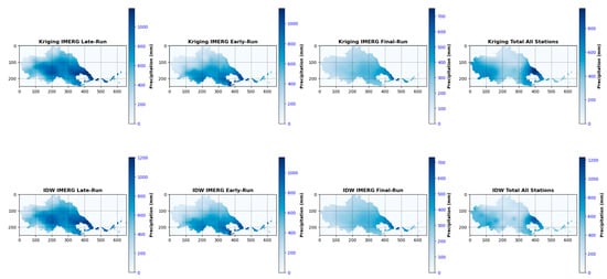 A handful of studies have used interpolation techniques and statistical parameters and indexes to evaluate the performance of hydrometeorological parameters [37,38,39,40]. To compare the IMERG products with our rain-gauge data, we followed the process below: firstly, we interpolated the ground truth data using the IDW and ordinary kriging methods for the total study period and also for the daily level. Additionally, we resampled our IMERG products according to the new IDW and kriging raster’s resolution in order to have as accurate a comparison as possible. Finally, we evaluated the interpolation methods and IMERG product with the aforementioned methodology.