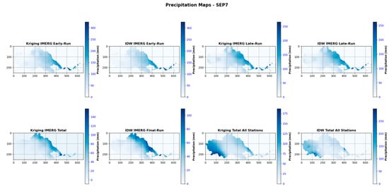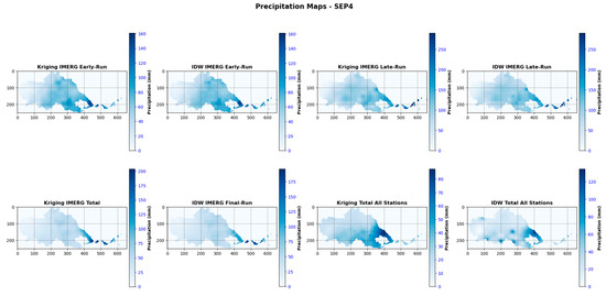 Results for 7 September indicate below-average (the same) performance by all IMERG products with low CC values and moderate levels of error. Among the three IMERG products, IMERG-LR performs best overall, with the highest CC (0.43) for IDW and (0.44) for kriging, as well as optimum KGE 0.43 for both interpolation methods. This indicates that IMERG-LR has a generally consistent relationship with the reference data, even when its performance is low. IMERG-ER closely tracks in terms of correlation (CC = 0.38–0.39), as well as values in terms of KGE (0.37 for IDW and 0.38 for kriging). Its highest bias, however, is 1.06 for IDW and 1.23 for kriging, meaning that it neither consistently overestimates nor underestimates rain. IMERG-FR, however, does the poorest, with the KGE values (−0.59 for IDW and −0.54 for kriging), reflecting poor correlation with the reference data. While it is improved in terms of RMSE than IMERG-ER (38.57 for IDW and 38.74 for kriging), it is plagued by high bias (13.05 for IDW and 13.14 for kriging), reflecting systematic overestimation of rainfall.