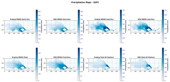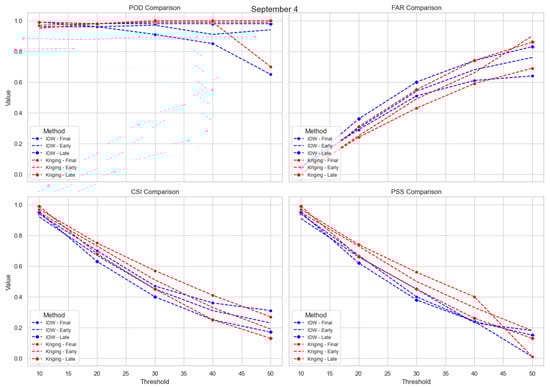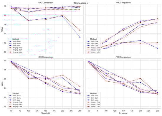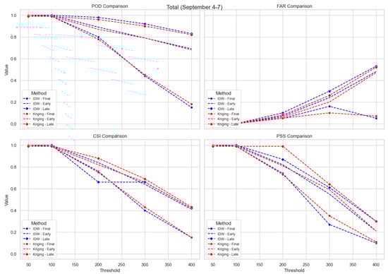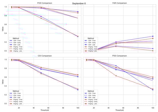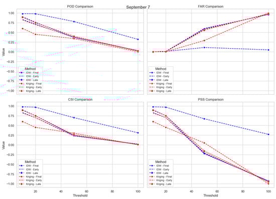 At 7 September, the final run considerably exemplifies the utmost level of reliability when tested, particularly when used in combination with the inverse distance weighting (IDW) approach, since it continuously registers high probability of detection (POD) values at low precipitation levels; that is, it scores a very impressive 0.98 at the 10 mm as well as the 20 mm levels, while at the same time maintaining the false alarm ratios (FAR) at the lowest levels (Figure 15). In contrast, an examination of the higher thresholds of 50 mm and 100 mm shows a considerable reduction in performance across methods, with kriging performing particularly poorly, culminating ultimately in complete failure at the 100 mm threshold, with a reported probability of detection (POD) of 0 and a false alarm rate (FAR) of 1. Although the early and late runs are performing well at low thresholds (10–20 mm), their performance deteriorates rapidly at larger thresholds (50–100 mm), mainly because of a large number of false alarms. These overestimations can affect operational decisions during extreme events. It is worth noting that although the late run demonstrates a slight enhancement of performance at lower thresholds compared to the early run, it should be understood that both runs exhibit very poor levels of skill when confronted with higher thresholds, reflecting the performance deficit indicated by the early run. As a conclusion, the final run derived from the IDW method is the most stable and reliable source of rainfall estimation, whereas the early and late runs tend to over-estimate the quantity of rainfall at the extremes, and this consequently results in an excessive count of false alarms that may influence decision-making procedures. The results underscore the critical importance of choosing appropriate interpolation techniques while recognizing their limitations for precipitation prediction across different scenarios.