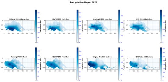 Spatial distribution of total rainfall (in mm) on 6 September 2023, as estimated by IMERG products (final, early, and late runs) and rain gauge interpolation (IDW and kriging). The x- and y-axes represent pixel grid coordinates of the resampled raster (not geographic coordinates). Rainfall intensity is color-coded.