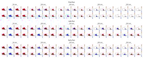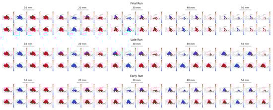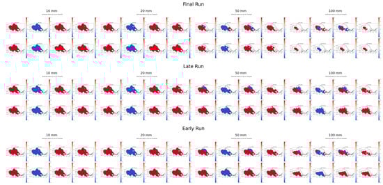 The spatial pattern of verification measures offers important information on the regional strengths and weaknesses of IMERG performance over Thessaly. Consistently across the various experiment runs and dates examined, the following spatial pattern was apparent: the southern and southeastern parts of the study area generally had higher values of probability of detection (POD) and Peirce skill score (PSS), especially at low thresholds (e.g., 10–50 mm), suggesting dependable detection and absence of bias for moderate precipitation events. In contrast, northwestern and mountainous areas often had higher false alarm ratios (FARs) and a lower critical success index (CSI), especially at high thresholds (greater than 100 mm), pointing to a higher incidence of overestimation and poorer model capability in representing extreme events.