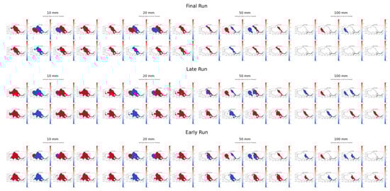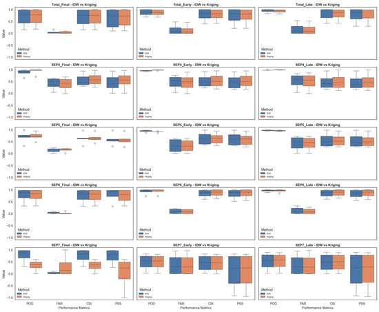 On 7 September, the spatial patterns of verification measures over the early, final, and late runs exhibit strong and coherent patterns regarding precipitation thresholds and interpolation skill (Figure 16). In the early run, the probability of detection (POD) is high over most of the domain at low thresholds (10 mm and 20 mm), particularly in the southern and central areas, but progressively deteriorates in the northeast at higher thresholds (50 mm and 100 mm). The false alarm ratio (FAR) increases significantly in the northwest and central regions with rising thresholds, suggesting a tendency for overestimation in those areas. The critical success index (CSI) and Peirce skill score (PSS) reveal more pronounced performance in the southeastern sector, with decreasing scores in the northwest, particularly at the 50 mm and 100 mm levels. The final run is characterized by enhanced spatial coherence and modest improvements across all four measures, notably in the southern and southeastern areas, where lower FAR and elevated POD, CSI, and PSS values suggest improved calibration and overall event detection. The late run reinforces these patterns, with decreased FAR over the entire domain and considerably higher PSS and CSI in the central and eastern regions, even at high thresholds. Overall, across all runs and measures, performance is consistently stronger in the south and southeast, while northwestern areas remain troublesome for all interpolation approaches, especially as rainfall thresholds increase.