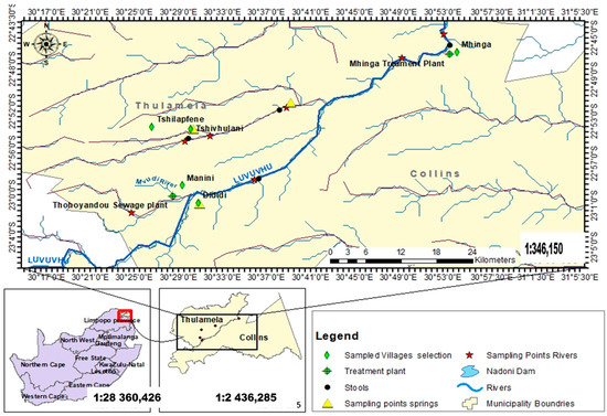 Geographical location of the study area in Vhembe District Municipality, Limpopo Province, South Africa. Note: The detailed geospatial map showing all sampling points, the Nandoni Dam, and the treatment plant is available in Mogane et al. [19], which covered the same study area (ArcGis 10.8, Esri, Redlands, CA, USA).
