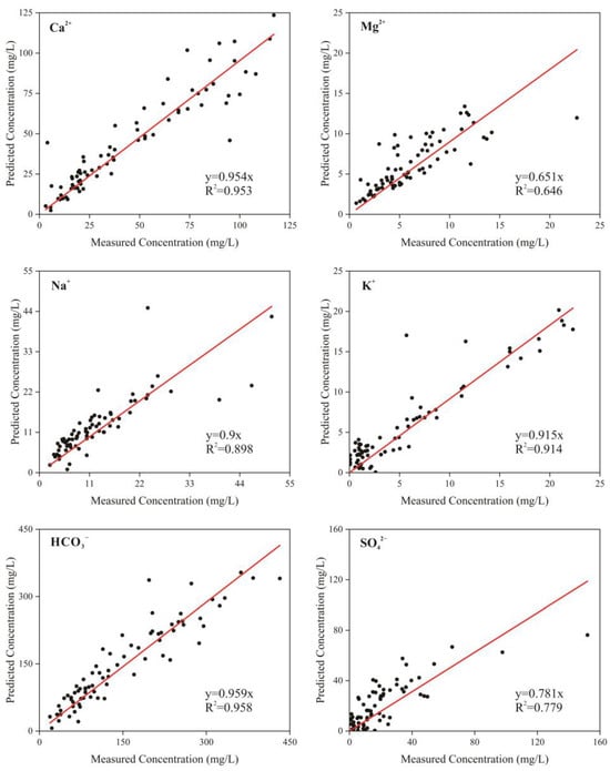 Based on principal component analysis, the functional relationships between the concentrations of various key water quality indicators were established using the APCS-MLR model to simulate water quality conditions. The results showed that the R2 values of the linear fit between predicted and measured concentrations of the main water quality indicators differed very little from the average fitting coefficient, indicating strong consistency between the two. The fitting results are presented in Figure 5. Therefore, in the Xin’an River Basin, the APCS-MLR model demonstrated good applicability for calculating and allocating the sources of groundwater quality indicators.