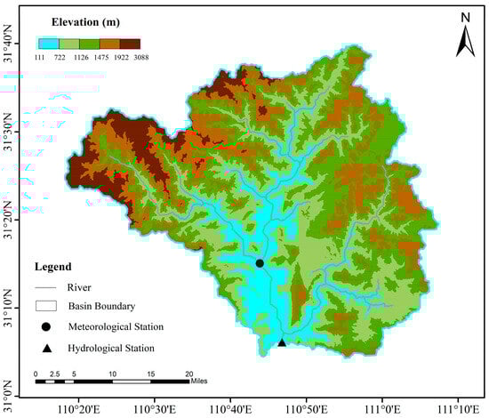 The Xiangxi River (110°47′–111°13′ E, 30°59′–31°07′ N) is located in the western part of Hubei Province and is the largest tributary of the Chuanjiang River on the north bank of the Xiling Gorge section of the Three Gorges. It originates from Xinhua in the Shennongjia Forestry District, with a drainage area of about 3100 square kilometers and a main stream length of approximately 97.3 km, as shown in Figure 1. The average annual runoff of the basin is 1.159 billion cubic meters per year. The basin’s terrain is primarily composed of high mountains and sub-high mountains. Forests are the predominant land use type in the basin, covering 87.36% of its total area. The climate of the basin is characterized by significant spatiotemporal variations in precipitation. The annual precipitation decreases from the northwest to the southeast, ranging from 900 to 1200 mm [55]. Meteorological data for the basin come from the Xingshan meteorological station, including daily precipitation, temperature, and evaporation. According to research, both the maximum temperature (Tmax) and minimum temperature (Tmin) in the basin are projected to increase under future climate change scenarios, especially under the high-emission scenario (SSP585), where the temperature rise is more significant. The changes in precipitation are more complex, with significant differences in precipitation changes under different General Circulation Models (GCMs) and Shared Socioeconomic Pathway (SSP) scenarios, showing both increases and decreases. The Shared Socioeconomic Pathways (SSPs) include three representative scenarios, SSP126, SSP245, and SSP585, corresponding to low-, medium-, and high-emission trajectories, respectively. The SSP126 scenario envisions a future where global efforts are focused on sustainable development, leading to effectively controlled and low levels of greenhouse gas emissions. In contrast, the SSP245 scenario represents a medium-emission future, where greenhouse gas emissions remain at a stable, moderate level. The SSP585 scenario, however, depicts a high-emission future that is heavily reliant on fossil fuels, with a significant increase in greenhouse gas emissions anticipated. This study employs the SSP scenarios to assess the combined impacts of climate change and human activities. This approach is chosen because the SSPs integrate both physical climate factors and socioeconomic dimensions, making them suitable for complex climate regions like the Xiangxi River Basin [56]. The SSP scenarios provide a more accurate prediction of runoff changes, which is crucial for water resource and ecological management. When combined with high-resolution climate data, the SSPs are particularly well-suited for basin-scale simulations. Compared to the Representative Concentration Pathways (RCPs), which lack socioeconomic considerations, and Integrated Assessment Models (IAMs), which focus on macro-scale interactions between climate and human systems, the SSPs offer detailed insights at the basin level. This makes them more appropriate for predicting future runoff in the Xiangxi River Basin.