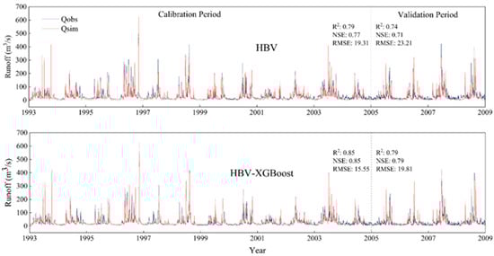 Figure 2 illustrates a comparison of the runoff simulation accuracy between the standard HBV model and the enhanced HBV-XGBoost model. During the model calibration phase, the runoff simulation results of the HBV model showed an R2 value of 0.79, an NSE value of 0.77, and an RMSE value of 19.31 m3/s. In contrast, the corresponding indicators for the HBV-XGBoost model were an R2 of 0.854, an NSE of 0.85, and an RMSE of 14.24 m3/s. These results indicate that the HBV-XGBoost model has a slight edge in simulation accuracy, being able to more accurately reflect the actual trends in runoff changes, with better data fitting and smaller errors. During the model validation phase, the performance indicators of the HBV model were an R2 of 0.74, an NSE of 0.71, and an RMSE of 23.21 m3/s. The performance indicators of the HBV-XGBoost model were an R2 of 0.79, an NSE of 0.79, and an RMSE of 19.81 m3/s, once again showing superior performance. These results demonstrate that during the calibration and validation stages, the HBV-XGBoost model maintains high fitting accuracy, can more accurately predict future runoff data, and better adapts to the complexity of hydrological processes, thereby improving the accuracy and reliability of runoff simulation.