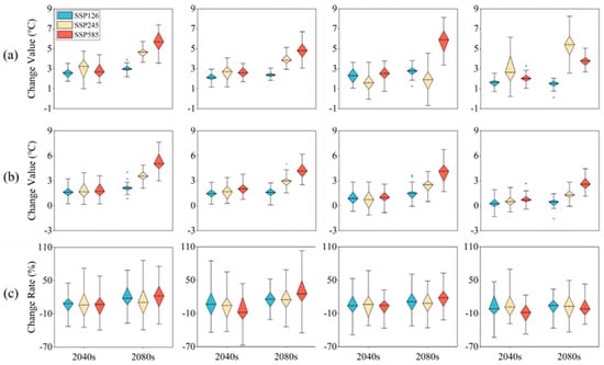 Figure 3 shows the trends in temperature and precipitation changes in the 2040s and 2080s of the 21st century under different Shared Socioeconomic Pathway (SSP) scenarios. The figure involves three SSP scenarios: SSP126, SSP245, and SSP585. First, as seen from Figure 3a, the daily maximum temperature (Tmax) is on the rise under all SSP scenarios. In the 2040s, the change in maximum temperature (Tmax) is the highest under the SSP585 scenario, with an average increase of 4.5 °C. Under the SSP126 and SSP245 scenarios, the increases are 2.5 °C and 3.5 °C, respectively. By the 2080s, Tmax increases by 6.5 °C under the SSP585 scenario, 3.5 °C under the SSP126 scenario, and 5.5 °C under the SSP245 scenario. This indicates that under the high-emission scenario (SSP585), the rise in Tmax is more pronounced. Figure 3b shows the trend in the daily minimum temperature (Tmin), which is similar to that of Tmax. In the 2040s, Tmin increases by 3.5 °C under the SSP585 scenario, 2.0 °C under the SSP126 scenario, and 3.0 °C under the SSP245 scenario. By the 2080s, Tmin rises by 5.5 °C under the SSP585 scenario, 3.0 °C under the SSP126 scenario, and 4.5 °C under the SSP245 scenario. This further confirms that under the high-emission scenario, the rise in Tmin is also more significant. Figure 3c reflects the rate of change in precipitation. In the 2040s, the changes in precipitation under different SSP scenarios are more complex, with both increases and decreases. For example, the rate of change in precipitation under the SSP585 scenario is approximately −10%, while the changes under the SSP126 and SSP245 scenarios are about −5% and 0%, respectively. By the 2080s, the rate of change in precipitation under the SSP585 scenario improves, with an average of about 5%, while the changes under the SSP126 and SSP245 scenarios are approximately 0% and −5%, respectively. Under the high-emission scenario (SSP585), precipitation might decrease in the short term but improve in the long term. In all scenarios, both the maximum and minimum temperatures are on the rise, with the most significant increases observed under the SSP585 scenario. Precipitation changes are more complex, with a potential decline in the short term, though this trend is anticipated to be offset by the 2080s.