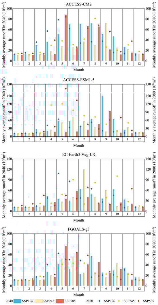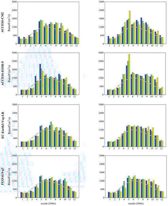 Table 3 highlights notable variances in how various Global Climate Models (GCMs) and climate scenarios influence the projected runoff for the decades of the 2040s and 2080s. The Sen slope measures the extent of the trend, and the M-K test determines whether the trend is statistically significant [61,62]. A positive Sen’s slope signifies an upward trend in runoff, whereas a negative slope implies a downward trend. The Z-value determines the significance of the trend, with a larger absolute value indicating a more pronounced significance. In the 2040s, the ACCESS-CM2 model under the SSP585 scenario shows a significant increasing trend with a Sen’s slope of 0.0025 m3/s and a Z-value of 1.33. In contrast, during the same period, the EC-Earth3-Vcg-LR model under the SSP245 scenario exhibits a non-significant decrease with a Sen’s slope of −0.0030 m3/s and a Z-value of −0.65. In the 2080s, the increase in runoff under the SSP585 scenario for the ACCESS-CM2 model is even more pronounced, with a Sen’s slope of 0.0047 m3/s and a Z-value of 2.15, indicating a trend towards increased runoff under high-emission scenarios. Conversely, under the low-emission scenario SSP126, the FGOALS-g3 model in the 2080s shows a significant decreasing trend, with a Sen’s slope of −0.0050 m3/s and a Z-value of −2.19. These results suggest that the impact of climate change on runoff is complex and variable, with considerable differences in predictions under different models and scenarios, highlighting the need to consider this uncertainty and complexity when formulating water resource management strategies. Moreover, these findings underscore the necessity for adjustments in runoff prediction and management strategies under different climate scenarios, particularly under high-emission scenarios.