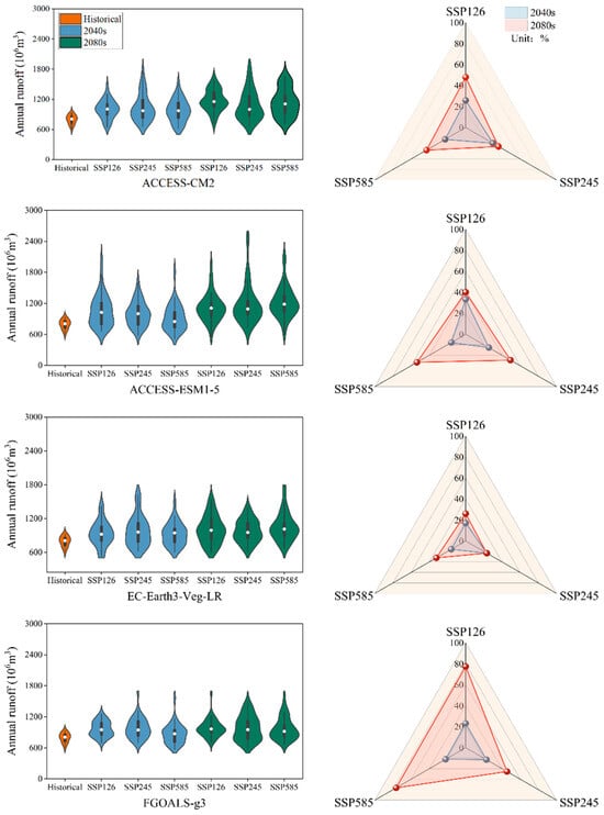 Figure 5 illustrates the predicted annual runoff using violin and radar plots. The violin plot on the left depicts the distribution of annual runoff across four GCMs under three scenarios, while the radar plot on the right offers a visual comparison of percentage changes relative to the historical period (1993–2008). The findings reveal substantial changes in the projected annual runoff under different scenarios. It is evident that all Global Climate Models (GCMs) forecast a notable increase in annual runoff under the high-emission scenario SSP585, particularly in the 2080s, suggesting a more severe impact of high-emission scenarios on water resources. For instance, the FGOALS-g3 model predicts the highest growth rate in runoff for the 2080s compared to historical data, at 76.54%, under the SSP585 scenario. The ACCESS-ESM1-5 model exhibits greater variability under the SSP585 scenario, with a more dispersed distribution of predicted runoff values, and a growth rate of 53% for the 2080s compared to historical data, indicating higher sensitivity to emission scenarios. The ACCESS-CM2 model and the EC-Earth3-Veg-LR model also show increases under the SSP585 scenario, but the magnitude of growth is relatively small. In contrast, apart from the FGOALS-g3 model, the other three models show smaller increases under the lower-emission scenarios (SSP126 and SSP245), indicating a lower impact of climate change. The FGOALS-g3 model predicts the highest growth rate in runoff for the 2080s under the SSP126 scenario, at 77.38%, compared to historical data. The ACCESS-CM2 model and the ACCESS-ESM1-5 model predict growth rates of 47.92% and 40.07%, respectively, for the 2080s under the SSP126 scenario. Under all scenarios, the runoff is anticipated to rise progressively from the historical period to the 2040s and then to the 2080s, suggesting that the influence of climate change on water resources will become more severe over time.