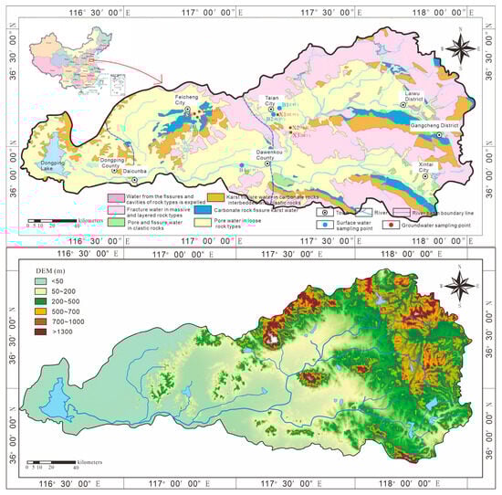 The study area encompasses hot spring sampling sites located along the middle reaches of the Wen River, specifically situated west of Daidaoan Hot Spring Road in Taian City, north of Qiaogou Village in Culai Town, and within Anjiazhuang Town, Feicheng City. Due to influencing factors including surface river water mixing and variable mining durations, the in situ geothermal water temperatures exhibit considerable variation, ranging from 28 °C to 54.2 °C, while closed-system measurements indicate potential reservoir temperatures reaching 80 °C. The geothermal water occurrence area lies at the junction of the Feicheng fracture basin, Dawenkou basin, and Tailai basin, with elevations ranging from 100 to 300 m. To the north is the Taishan bulge, with an elevation exceeding 1532 m; to the east is the Feedback Mountain bulge; and to the southwest is the Talesanbushan bulge. The geothermal water outcrops are distributed in the fracture zones of the Feicheng Fracture, Wenkou Fracture, and Taian–Dawangzhuang Fracture, showing obvious control by these fractures. The distribution area is small, the geothermal gradient in the overlying strata is high, and the thermal reservoir is shallow with belt-like characteristics. This study systematically investigates the geological structure and hydrogeological conditions of the study area. Through comprehensive analysis of hydrogeochemical and isotopic characteristics of geothermal fluids, we quantitatively determine the recharge elevation, thermal reservoir temperature, and origins of both water and heat sources. Furthermore, we elucidate the genetic mechanisms governing the geothermal system. The findings provide crucial hydrogeological insights to support sustainable development and utilization of local geothermal resources.
