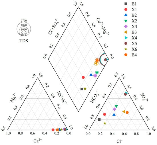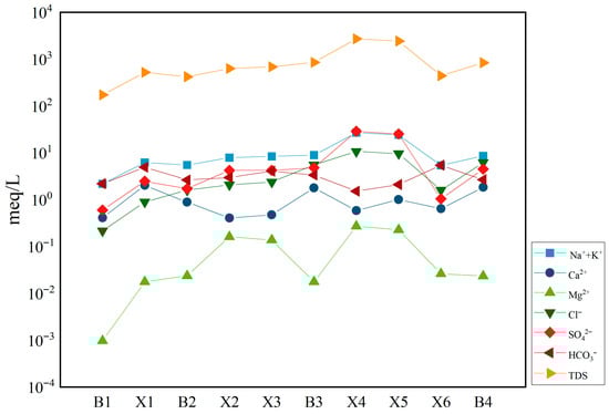 3−, the content of other elements showed a similar trend to TDS, suggesting that they may have undergone similar water–rock interactions or have similar sources. Ca