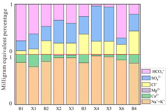 − ranges from 7.72 to 382.41 mg/L. Among them, B1, X1, B2, and X6 have HCO