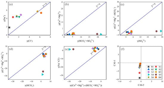 Figure 6e indicates that, except for X4 and X5, the other water samples may have cation exchange interactions. The Chlor Alkali Index (CAI) is used to characterize the direction of cation exchange. When both CAI-1 (Formula (9)) and CAI-2 (Formula (10)) are greater than 0, it indicates reverse cation exchange, and both CAI-1 and CAI-2 are less than 0. As can be seen from