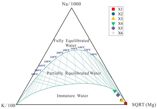 The Na-K-Mg triangular equilibrium diagram is an important method for judging the cation equilibrium state in geothermal water. Giggenbach (1988) classified the water–rock equilibrium state of geothermal water into fully balanced water, partially balanced water, and immature water [