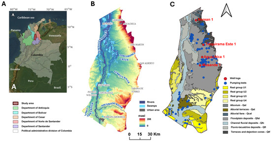 Study area illustrating (A) the general location and administrative departments along with (B) elevation in meters above mean sea level, municipalities, and major surface water bodies. This figure highlights the spatial position of the Middle Magdalena Valley (MMV), with an emphasis on its topography. The HydroSHEDS DEM (World Wildlife Fund, 2006–2013), derived from NASA’s Shuttle Radar Topography Mission (SRTM) at 92 m spatial resolution, was utilized for this analysis. The figures were generated using ArcGIS Pro software, Version 3.1. In (C), a geological map displaying outcropping of Neogene–Quaternary units in the northern Middle Magdalena Valley, the locations of wells with geophysical logs, and those where pumping tests were conducted. The figures were generated using QGIS software, Version 3.36.2.