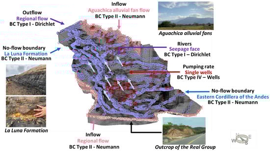 Figure 3. Conceptual model of the regional groundwater flow system in the Middle Magdalena Valley (MMV). Boundary conditions are represented and illustrated with field photographs taken by the author. The main groundwater flow direction is indicated by light blue arrows. The figure was generated using FEFLOW v.8.1 (Update 3), 64-bit version (May 2024).Based on piezometric data collected from 434 water points, a main regional groundwater flow direction with a south-to-north flow direction was identified, discharging into swampy bodies located in the northern part of the study area. Additionally, intermediate flow paths were observed in an east–west direction, originating from the alluvial fans of Aguachica and discharging into the Magdalena River.Annual average precipitation ranges from 3700 mm/year in the south to 1000 mm/year in the north [62]. For this reason, recharge was considered as a spatially distributed input, accounting for both the precipitation variability and land use/land cover conditions described by Lora et al. (2024) [3]. Recharge constituted one of the parameters calibrated during the numerical modeling process. - Numerical Modeling CodeFEFLOW version 8.1 was used as the modeling code for the implementation of the numerical model. This software applies the finite element method and is designed for simulating flow and transport processes in porous and fractured media [87,88]. It supports both manual and automatic calibration through integration with FEPEST, the FEFLOW-integrated module for PEST [89,90]. This helps to facilitates the adjustment of model parameters, particularly hydraulic conductivity, making it appropriate for the modeling objectives.