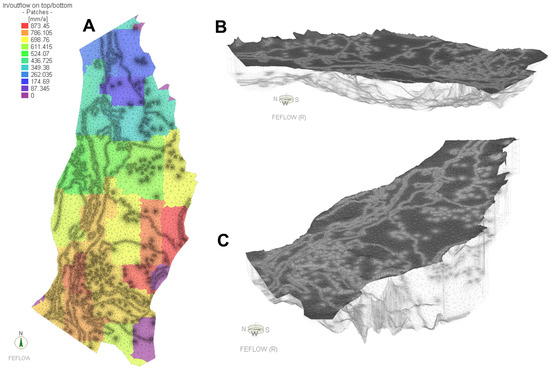 Figure 4. Mesh configuration of the numerical model and spatial distribution of recharge. In (A), the two-dimensional mesh of the model domain is displayed, with patch colors representing groundwater recharge (mm/year) applied at the upper boundary; (B,C) illustrate the corresponding three-dimensional mesh, showing the vertical discretization of the Neogene–Quaternary aquifer system. All figures were generated using FEFLOW version 8.1.As described in the conceptual model, the precipitation regime and land use/land cover patterns vary significantly between the southern and northern parts of the study area. To estimate the effective recharge, a hydrological model based on Hydrological Response Units (HRUs) was applied [64]. Recharge rates were determined through an inverse calibration process, resulting in values ranging from 12% to 33% of the annual average precipitation, depending on the HRU. Higher annual recharge values were observed in the southern sector, in line with the spatial distribution of precipitation (Figure 4A).The boundary conditions of the numerical model were established according to the conceptual understanding of the regional hydrogeological system. A Neumann-type condition was applied at the southern boundary to represent regional inflow into the aquifer. On the eastern boundary, a prescribed flow condition was assigned in the northern sector, associated with the Aguachica alluvial fans, while a no-flow condition was set in the southern sector due to the presence of Cretaceous outcrops from the Eastern Cordillera that dip eastward (away from the study area), and as such do not contribute flow to the model domain. Similarly, the western boundary was defined as no-flow in the northern sector due to the presence of low-permeability Cretaceous units such as the La Luna Formation, while a prescribed flow condition was assigned to the southern sector. At the northern boundary, a Dirichlet-type condition was implemented using piezometric levels derived from the available water table data.According to secondary data provided by the Regional Environmental Authorities (CARs) responsible for granting water abstraction licenses in Colombia, 3962 groundwater points were identified within the model domain; however, only 12.95% of these (513 points) had records of permitted discharge rates, defined as the maximum authorized extraction. These discharge values were incorporated into the model as outflows (BC Type IV—Single Well), totaling 83,911.8 m3/day.The model was constructed using five layers. The top layer represents the Quaternary deposits, while the four underlying layers correspond to the sub-units of the Real Group. The model was then parameterized on the basis of this structure. The uppermost layer was subdivided into different Quaternary geomorphological units, each considered a zone of uniform hydraulic conductivity (Figure 5). Similarly, each sub-unit of the Real Group was divided into northern and southern sectors to account for the marked differences in granulometric composition across the study area, where sandy materials predominate in the north and clayey materials in the south [64,91].