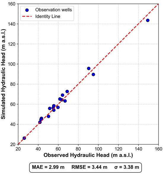 Figure 6. Calibration plot for the regional-scale groundwater flow model. The figure was generated using Python (Jupyter Notebook v7.0.8, Anaconda distribution) based on the steady-state simulation outputs exported from FEFLOW v8.1.The water balance of the model showed a total imbalance of , which is considered numerically negligible. This result confirms adequate conservation of water mass in the system and consistent implementation of the boundary conditions, recharge, and discharge terms according to the conceptual model. Regarding the flow distribution, the main inflow corresponds to infiltration recharge, with a total rate of 53.33 m3/s, while the most significant outflow takes place through the northern boundary, with 52.61 m3/s.Given that the main objective of this simulation was to estimate hydraulic conductivity values for comparison with the proposed methodology, the calibrated values of K are presented in the results section (Section 3).