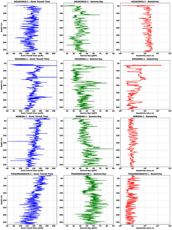 Hydraulic conductivity estimation was performed by applying the proposed methodology utilizing geophysical well logs (Figure 7) acquired from four wells in the MMV basin: Aguachica-1, Musanda-1, Norean-1, and Tisquirama Este-1 (Figure 1). The selection of these wells was based on a pre-existing 3D geological–geophysical model of the region, which enabled the identification of their intersection with both Quaternary deposits and Neogene formations. Specifically, these wells penetrate Quaternary deposits as well as the two upper units (U4 and U3) of the Real Group.