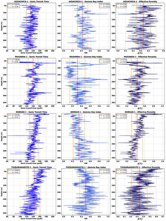 Depth profile of sonic transit time, gamma ray index, and effective porosity for the Aguachica-1, Musanda-1, Norean-1, and Tisquirama Este-1 wells. The mean and standard deviation are reported for each parameter.