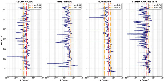 Hydraulic conductivity (K) as a function of depth for the Aguachica-1, Musanda-1, Norean-1, and Tisquirama Este-1 wells. Each profile represents the vertical distribution of K, with the mean and standard deviation indicated for each well.