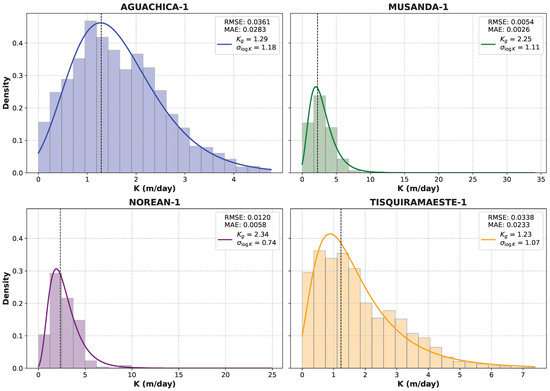 Probability density functions of hydraulic conductivity (K) for the Aguachica-1, Musanda-1, Norean-1, and Tisquirama Este-1 wells. The figure presents the normal distribution fitted to each dataset, displaying the mean () and standard deviation (), along with the root mean square error (RMSE) and mean absolute error (MAE) as indicators of goodness of fit.