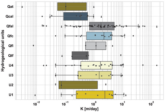 Hydraulic test interpretation is the primary field method for determining the hydraulic properties of the subsurface [35]. In this study, 131 pumping tests were compiled and reinterpreted. Utilizing the geological understanding of the study area, a statistical characterization of the hydrogeological units was conducted based on estimated hydraulic conductivity values. Based on this analysis, the methodology implemented to estimate hydraulic conductivity values from well logs was validated by comparing the results obtained with the characterization performed using conventional hydraulic tests.