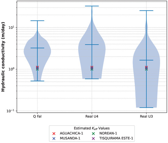 The estimated temperature values were used to calculate the coefficient , which is required for the estimation of hydraulic conductivity based on the equation proposed by Csókás [77]. Using these values, hydraulic conductivity profiles were generated for each well (Figure 9). However, the primary objective of this study is not merely the estimation of conductivity profiles, but evaluation of whether the effective hydraulic conductivity values obtained along each well can be utilized for the parameterization of numerical hydrogeological models in contexts with limited hydraulic data. To this end, the mean effective hydraulic conductivity was determined for each well: 1.65 m/day in Aguachica-1, 2.95 m/day in Musanda-1, 2.84 m/day in Norean-1, and 1.78 m/day in Tisquirama Este-1, with standard deviations of 0.93 m/day, 2.08 m/day, 1.87 m/day, and 1.29 m/day, respectively.