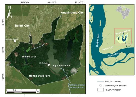 - De Queiroz Xavier Brasil, N.M.; Neto, A.B.B.; Paumgartten, A.É.A.; de Queiroz Xavier Silveira, J.M.; da Silva, A.A. Análise multitemporal da cobertura do solo do Parque Estadual do Utinga, Belém, Pará/Multitemporal analysis of the soil coverage of the Utinga State Park, Belém, Pará. Braz. J. Dev. 2021, 7, 36109–36118. [Google Scholar] [CrossRef]