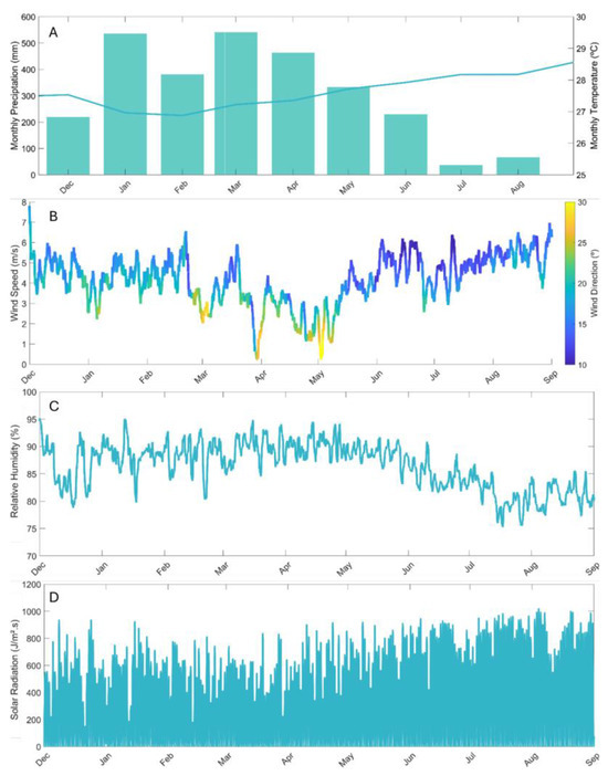 The input data were primarily meteorological, including air temperature (C), relative humidity (%), and wind speed and direction (m/s), obtained by the OCA station, while solar radiation (J/m2·s), precipitation (mm/day), and cloud cover (%) data were obtained from the INMET station for the period from November 2023 to October 2024 (Figure 2), a period that covers both dry and rainy seasons.