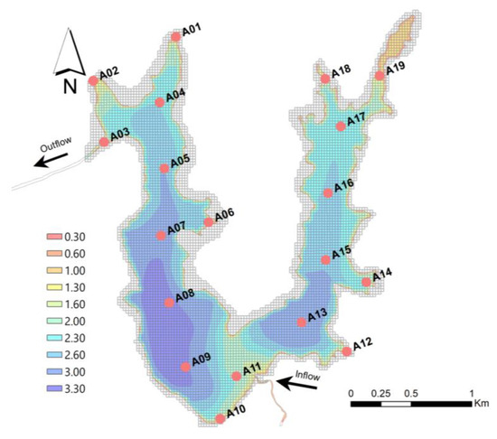 Illustration of the discretized domain, highlighting the lake’s bathymetry and sampling points, and the system’s water inflow and outflow locations.