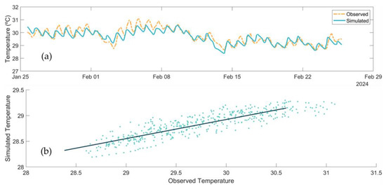 Furthermore, the Pearson correlation coefficient (ρ = 0.89) and coefficient of determination (R2 = 0.79) indicate good agreement with observed data. Regression analysis confirmed a strong positive correlation between simulated and measured temperatures (Figure 4).