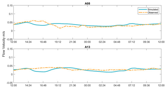 For flow velocities at monitoring points A08 and A13, only RMSE and Pearson correlation were used to compare observed and simulated data. The RMSE values were 0.009 m/s and 0.012 m/s, while the Pearson correlation coefficients (ρ) were 0.1 and 0.5, respectively. As previously stated, these statistical metrics are relatively weak, which is expected in shallow-lake simulations, due to the predominantly lentic flow conditions. Shallow lakes often experience rapid velocity fluctuations caused by wind gusts and rainfall [49,63]. Additionally, tall trees along the banks of Lake Água Preta obstruct wind flow, leading to a slight overestimation of modeled velocities (Figure 5).